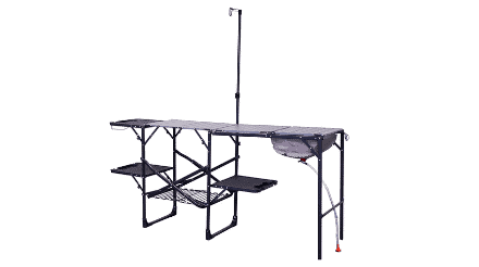 GCI Outdoor has a higher strength portable kitchen that comes with a countertop, storage rack, fold-out side tables, a foldable sink with drain, hooks for grilling utensils, rubbish bags, and paper towels, and stem glass holders if you’re ready to add a few more pounds to your cargo load.