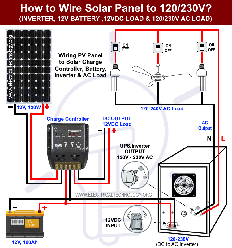 PV Panel, UPS-Inverter, 12V Battery, and 120-230V AC Load Wiring