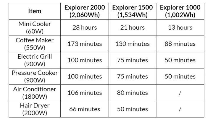 Check out this chart to see what kind of power you can anticipate from some of the most popular Jackery Power Stations:
